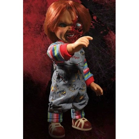 The Mezco Designer Series Talking Pizza Face Chucky features an all-new head sculpt, depicting Chucky's mutilated face after a run in with the Grim Reaper's scythe in the "Devil's Lair".